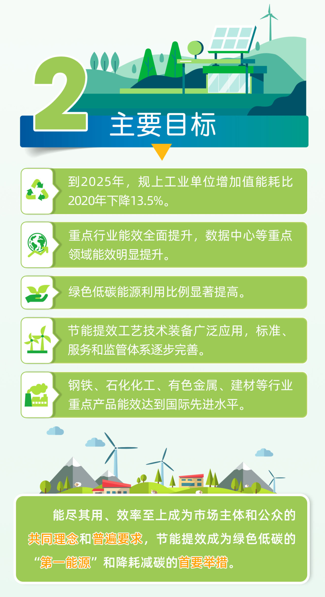 主要目標是到2025年,重點工業行業能效全面提升,數據中心等重點領域能效明顯提升,綠色低碳能源利用比例顯著提高,節能提效工藝技術裝備廣泛應用,標準、服務和監管體系逐步完善,鋼鐵、石化化工、有色金屬、建材等行業重點產品能效達到國際先進水平,規模以上工業單位增加值能耗比2020年下降13.5%。能盡其用、效率至上成為市場主體和公眾的共同理念和普遍要求,節能提效進一步成為綠色低碳的“第一能源”和降耗減碳的首要舉措。同時,結合產業發展實際提出一系列具體目標,到2025年,新增高效節能電機占比達到70%以上,新增高效節能變壓器占比達到80%以上,新建大型、超大型數據中心電能利用效率(pue)優于1.3,工業領域電能占終端能源消費比重達到30%。