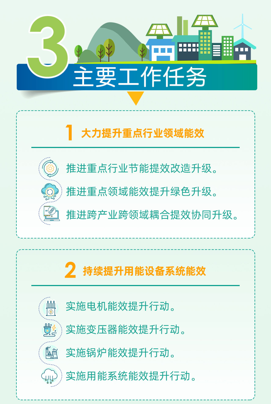 《行動計劃》聚焦重點用能行業、重點用能領域和重點用能設備,分業施策,分類推進,系統提升工業能效水平;加強全鏈條、全維度、全過程用能管理,強化標準引領和節能服務,協同提升大中小企業、工業園區能效水平;統籌優化工業用能結構、數字賦能等對節能提效的促進作用,全面提升工業能效基礎。具體提出7個方面任務:
