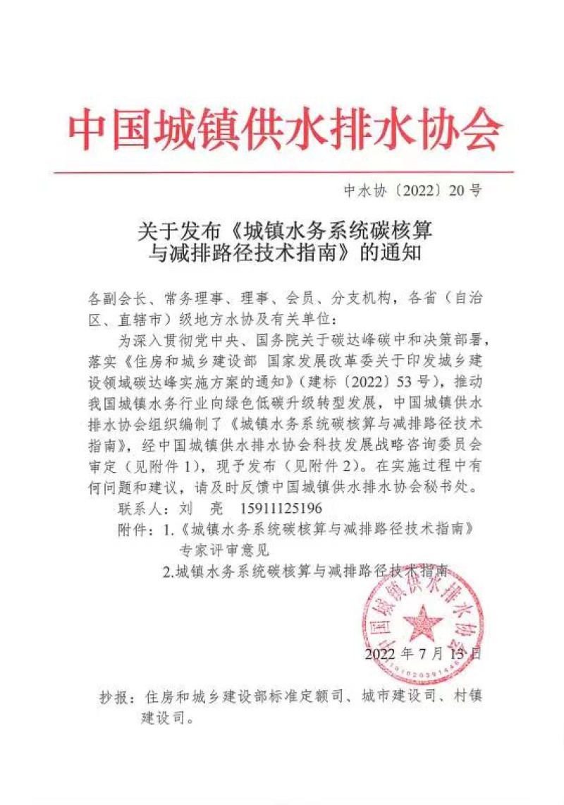 為深入貫徹黨中央、國務院關于碳達峰碳中和決策部署,落實《住房和城鄉建設部 國家發展改革委關于印發城鄉建設領域碳達峰實施方案的通知》(建標〔2022〕53號),推動我國城鎮水務行業向綠色低碳升級轉型發展,中國城鎮供水排水協會(以下簡稱中國水協)組織北京建筑大學、北京首創生態環保集團股份有限公司、北京城市排水集團有限責任公司、中建環能科技股份有限公司、中國市政工程中南設計研究總院有限公司、哈爾濱工業大學等單位編制了《城鎮水務系統碳核算與減排路徑技術指南》(以下簡稱指南),現予發布。