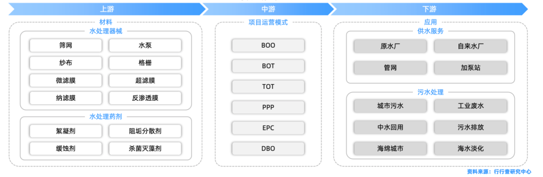 從整個產業鏈看,水處理行業是指由原水、供水、節水、排水、污水處理及水資源回收利用等形成的產業鏈,此外還包括再生水利用、污泥處理等與水處理有關的衍生行業。