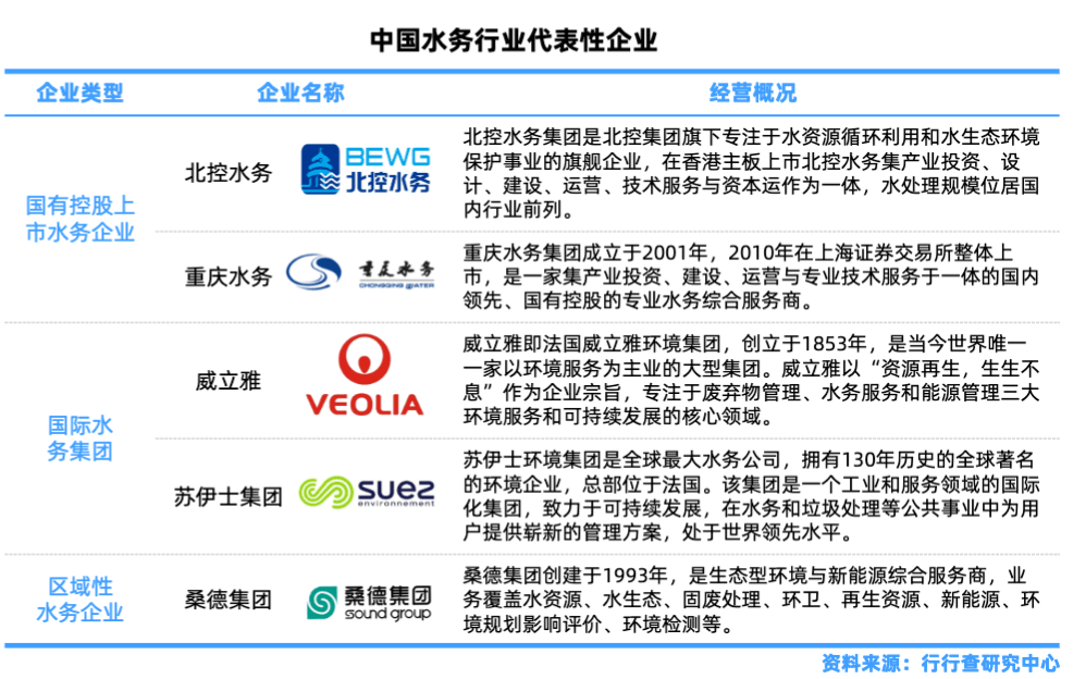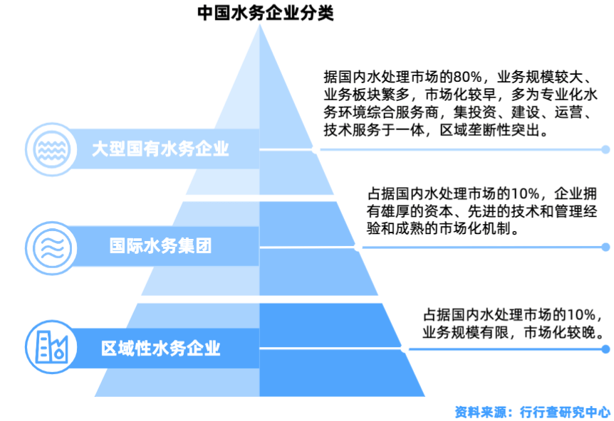 大型國有水務企業、國際水務集團以及區域性水務企業成為水處理行業的主要競爭者。