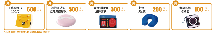 注:積分可在展會現場兌換天貓購物卡、按摩儀、恒溫杯套裝、u型枕等精美禮品。
